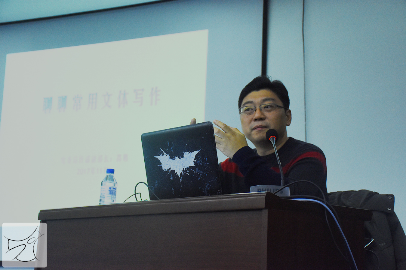 培训伊始,高鹏副部长以近年毕业论文的审核为切入点,指出了常用文本写作技能对当代大学生的重要性,并以幽默的口吻把文本写作的要点娓娓道来。他希望学生能通过写作达到探索自我与分享和传达的目的。写作已经逐渐成为当今社会的基本素养,公文写作也越来越贴近生活,例如通知,请假条,自荐信等文体的使用愈加普遍,所以对常用公文写作的掌握非常重要。高鹏副部长希望同学们能多读书看报,提高文本写作能力,从而达到自身综合素质的提升。他还提到卢新宁在北大中文系毕业典礼上的致辞《我唯一的害怕》,以此激励同学们在逐步迈向社会的过程中保持激情与理想。