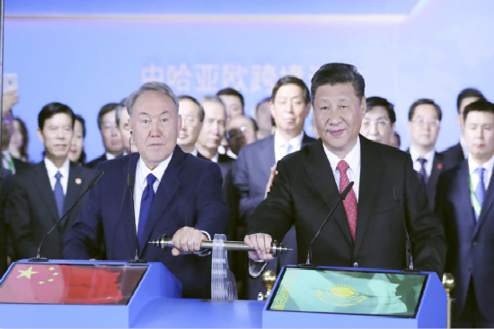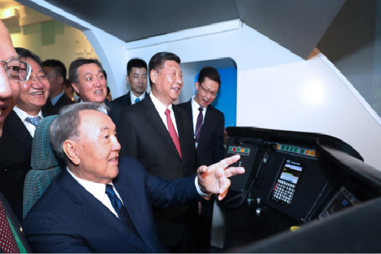 6月8日,习近平在哈萨克斯坦总统纳扎尔巴耶夫陪同下,参观阿斯塔纳专项世博会中国国家馆,并共同出席中哈亚欧跨境运输视频连线仪式。两国元首共同推动操控杆,视频显示两个分会场4列火车鸣笛开行。
