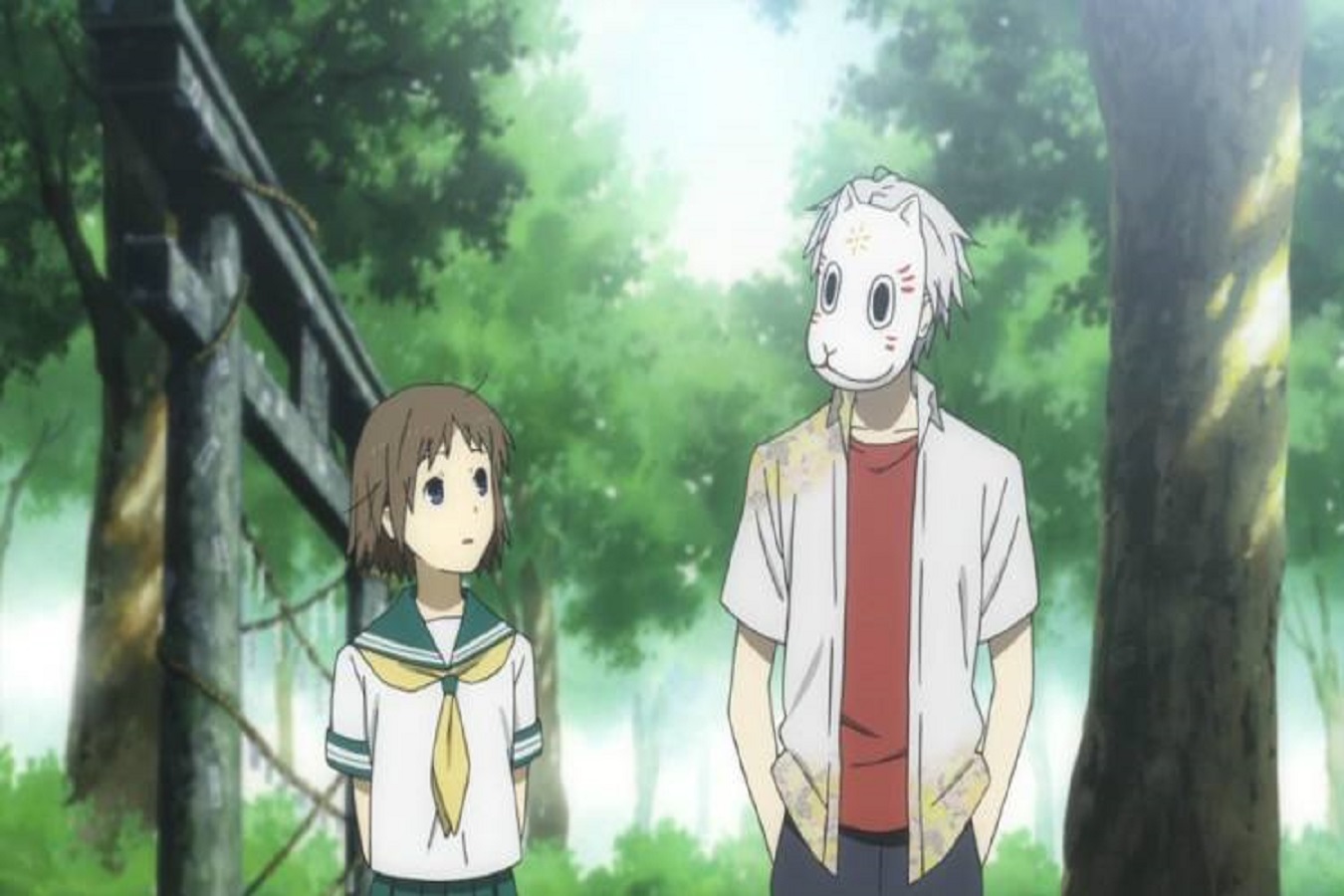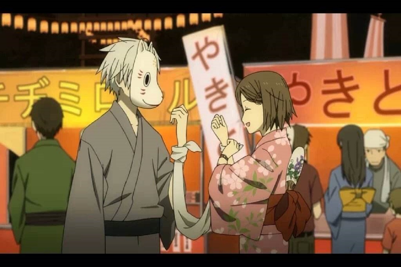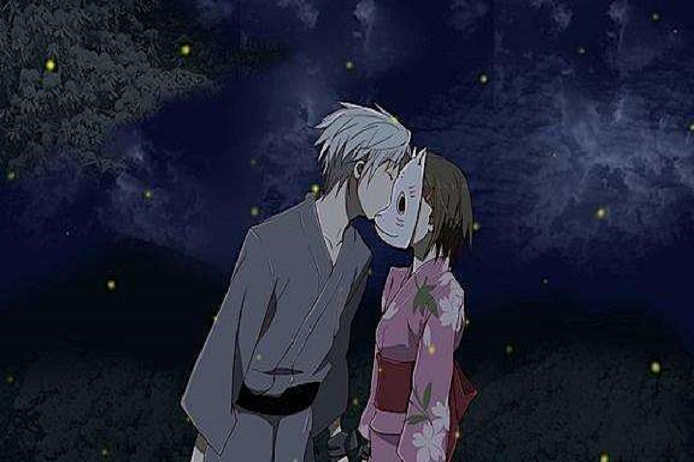 那晚,他与她穿着和服,他隔着面具吻了她,无疑令人心酸,无法触碰的爱恋,竟要用如此特殊的方式去诠释。出自本能,他扶起了摔倒的小孩,也第一次触碰了人类。即将消失的刹那,他并无丝毫恐惧,而是在点点萤火向她张开手臂:“来吧,萤,我终于可以触碰你了。”含泪拥抱的瞬间,彼此的心跳交织,仿佛倾尽所有,却终随少年雪花般的消逝化作句点。只留,女孩的哭泣与林间的萤火,连同那个带有吻痕的面具。心若刀绞,原来失去一个人,是如此令人窒息。其实,美丽的故事都是没有结局的,只因为它没有结局才会更加美丽。正如女主所言,时光终有一天会将我们分开,但是,即使如此,在那日降临之前,让我们一直在一起吧。