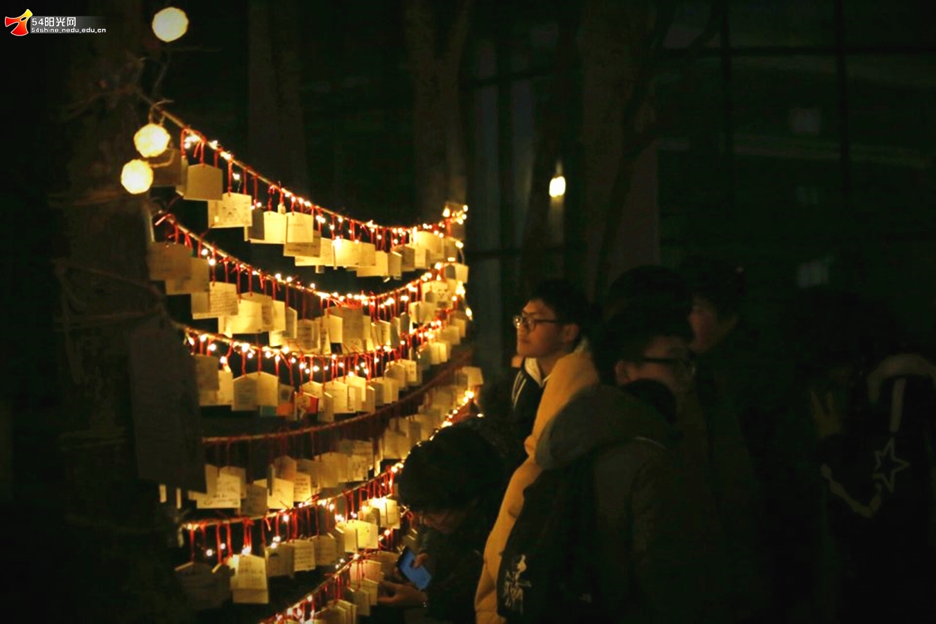 绘马祈愿是源于日本的一种祈福方式,通过悬挂写有自己心愿的木牌以达到许愿的目的。此次活动我们沿用了这种祈福方式,并将活动分为愿望收集、绘马展示和返还绘马三个阶段。愿望收集阶段持续了两天,从27日至28日。期间,日协成员在第二教学楼和第三教学楼的一楼大厅免费发放绘马木牌,收集同学们的愿望并认真登记。大家参与活动的热情十分高涨,许的愿望也琳琅满目。有的同学许愿家人朋友幸福开心;有的同学许愿考试顺利通过;有的同学许愿想要和喜欢的人在一起;也有临毕业的学长许愿希望母校能够越来越好。28日的晚上,写满大家心愿的木牌被日协成员挂在了第三食堂与二教门口,并装饰了温暖的彩灯。夜色笼罩下,绘马们显得如梦似幻;彩灯映照着,像是大家的愿望在闪闪发光,风吹过木牌响动的声音悦耳地让人忍不住闭起眼睛,这声音传了很远很远。