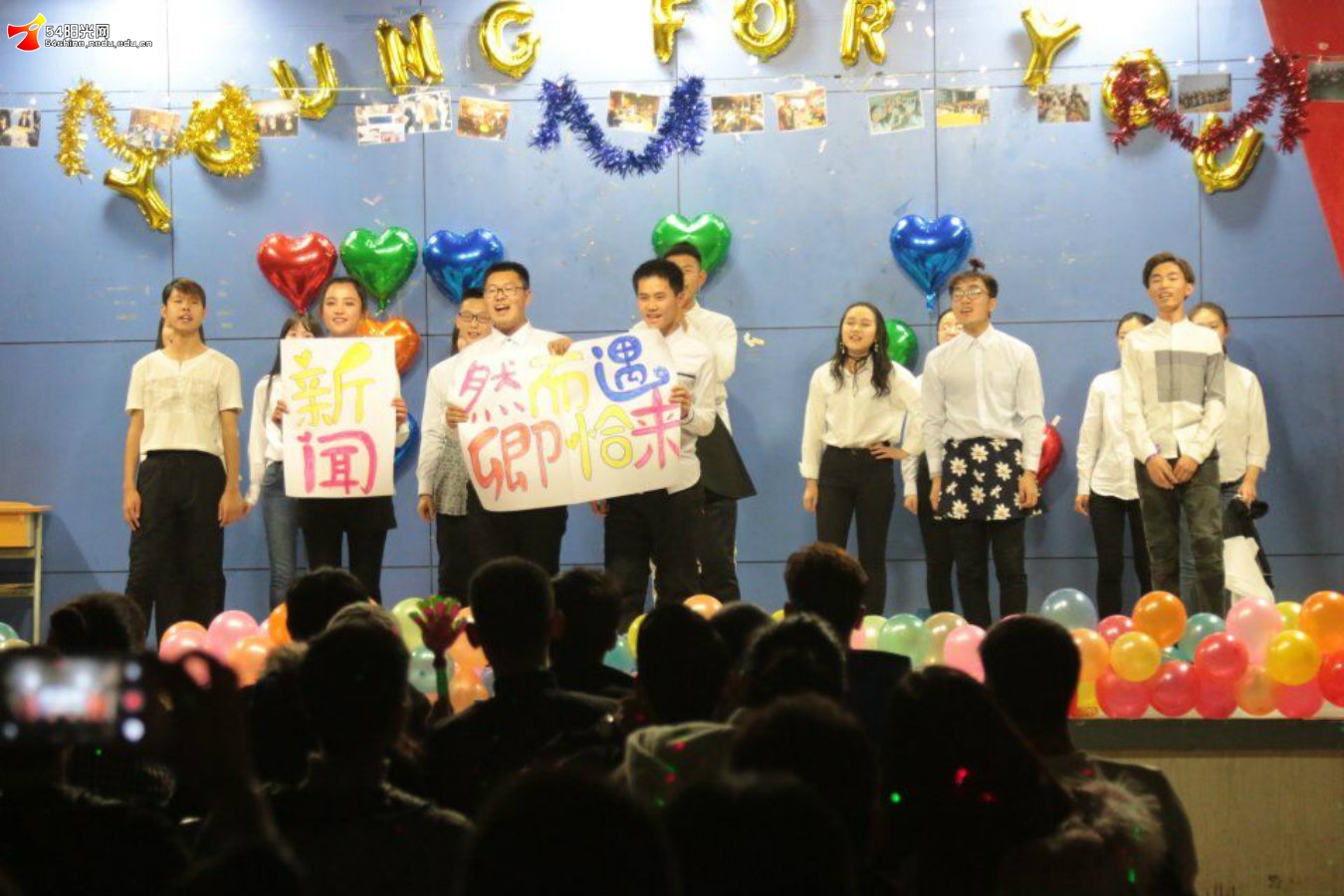 经过了演出前各大部门一个多月的精心准备及两次彩排审核,经贸人们期盼已久的迎新晚会终于拉开了帷幕。 激昂的音乐骤然响起,昏暗的舞台刹那闪亮,一个个活力四射的身影冲上舞台,在一瞬间吸引了所有人的目光,青春的火花点燃了在场每一个人的激情,燥动起观众的内心,主持人登台,一个个精心打造的节目更是让晚会现场的气氛节节升温。由组织部、财务部、培训部、外联部分别带来的小品《地铁故事》 、《劣场》 、《非诚不扰》 、《镖师》小品构思奇特,笑点接二连三,让人笑声不断;歌曲串烧精彩纷呈,美妙的歌喉缔造绕梁不散的余音;文艺部的开场舞、外联部的《panama》 、秘书处的《秘密行动》动感的舞姿、闪烁的灯光,掀起一阵欢呼;网宣部别出心裁的哑剧《站头在哪》,有肢体表达另类的幽默,用夸张彰显人性的美好;文艺部带来的《匆匆那年》让我们回到了那个纯真美好的高中岁月,引起了观众的共鸣。其中由新闻部提供的《新闻联播》节目,以新闻联播为背景,串联起手舞,搞笑课堂,歌曲,舞蹈等多种元素,异彩纷呈,一度达到了晚会的高潮。最后,部长们集体献上的舞蹈更是引爆了全场。认真的前期排练,精美的舞台布置,再加上梦幻般的演绎,一同呈现了这样一场视觉盛宴 ,欢声笑语充满了整个会场。