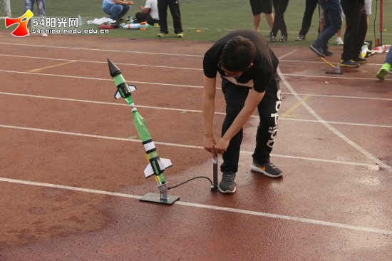 本次水火箭大赛面向全校同学,共有参赛小组61组,报名人数众多。本次比赛以“绿色环保”为原则,制作水火箭所需材料主要为废弃的塑料瓶。同时,参赛组内部成员相互沟通、协作完成比赛作品。这样不仅提高了选手们的动手能力,同时也培养了团队协作精神。大家聚集在新校区操场,等待着自己科技成果的展示。比赛开始后,大家将自己的水火箭安装到发射架上,使用打气筒打气,利用空气压强的原理发射水火箭,每一次水火箭的起飞都伴随着欢呼和掌声,与之一同飞向蓝天的还有那颗对航空航天科技的热爱。经过比拼,本次水火箭大赛最佳成绩达到了惊人的150米,创造了新的校园吉尼斯记录。